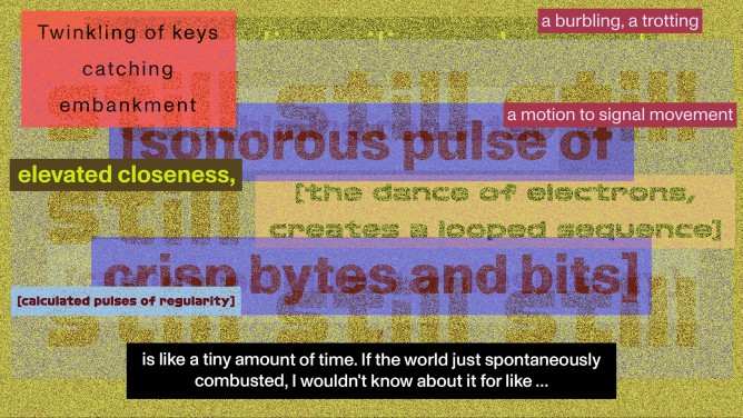 Image description: A screen of many layered captions in a caustic soup of fizzing, golden-puke static. In tomato red, top left: ‘twinkling of keys catching embankment’. Spread out across the way, strawberry on fuschia: ‘a burbling, a trotting … a motion to signal movement’. Fragment: ‘elevated closeness’ and elsewhere, ‘calculated pulses of regularity’. The eye rounds the bend, comes to the bottom of the frame and finds a subtitle, sensible white type on black: ‘is like a tiny amount of time. If the world just spontaneously combusted, I wouldn’t know about it for like …’ – and so it trails off into a future duration. The largest letters are plum against purple: sonorous pulse of crisp bytes and bits. They’re fading into the soup, eroding. Deeper in the fuzz, ‘the dance of electrons, creates a looped sequence’ and barely there, repetitions of the word ‘still’. And then it’s just static, and what lost language is dissolved therein?